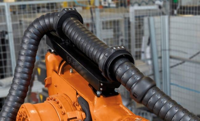 Roboty przemysłowe do montażu części samochodowych w przemyśle motoryzacyjnym pracują często z bardzo dynamicznymi ruchami na maksymalnym możliwym zakresie. Użytkownicy wybierają e-prowadniki, aby zapewnić bezpieczne prowadzenie przewodów do transmisji danych, pneumatycznych i zasilających na robocie. e-prowadniki triflex R firmy igus są bardzo użyteczne, ponieważ zostały specjalnie zaprojektowane do branży robotycznej i dostosowują się do trójwymiarowych ruchów robotów. Jednak, wraz z rosnącą różnorodnością zautomatyzowanej technologii produkcji, konieczne jest prowadzenie nie tylko przewodów elektrycznych i pneumatycznych, ale także węży do śrub,nitów i wkrętów.