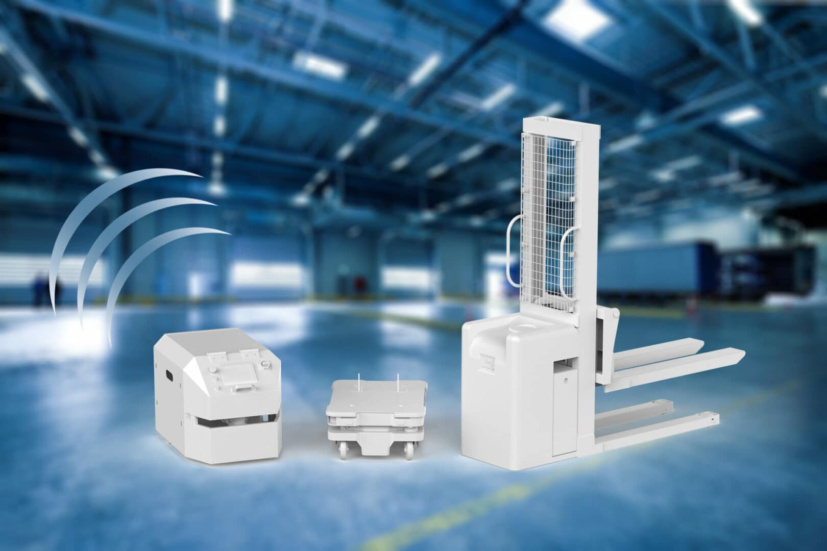 Roboty mobilne transportują materiały z jednego miejsca do drugiego i występują w dwóch typach: jako zautomatyzowane pojazdy kierowane (AGV) i autonomiczne roboty mobilne (AMR). Pojazdy AGV wykorzystują infrastrukturę naprowadzającą (przewody , odbłyśniki lub paski magnetyczne), aby podążać ustalonymi trasami. Jeśli obiekt blokuje ścieżkę pojazdowi AGV to zatrzymuje się i czeka, aż obiekt zostanie usunięty.