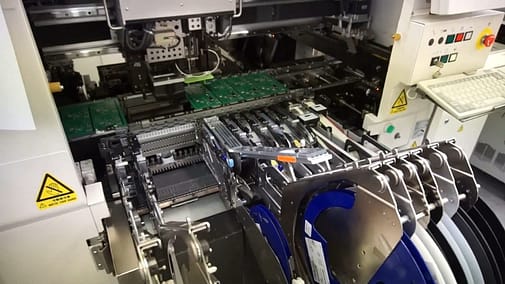 Rysunek 2 przedstawia linię SMT z serią podajników zawierających zwoje komponentów elektronicznych (na pierwszym planie). Każdy komponent, w tym etykiety, jest pobierany przez maszynę „pick and place” i umieszczany dokładnie w przypisanym miejscu na płytce PCB, która przesuwa się wzdłuż taśmy produkcyjnej.
