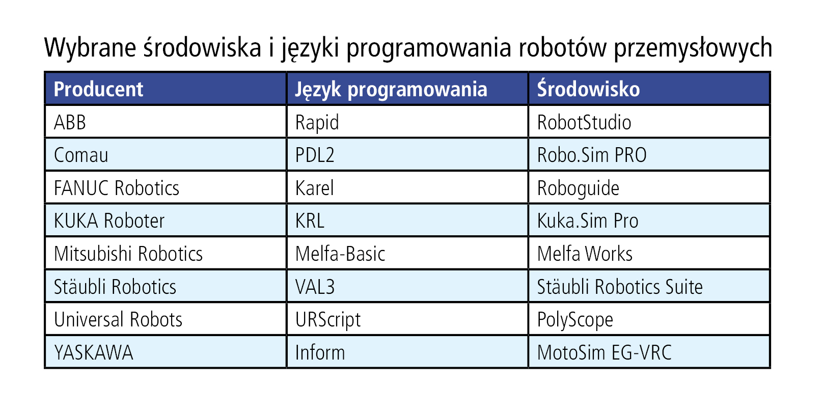 Cieniem na tym pozytywnym obrazie kładzie się fakt, że każde z tych środowisk bazuje na innym języku programowania specyficznym dla danego producenta. ABB korzysta z Rapid, Comau z PDL2, FANUC z Karela, KUKA z KRL, Mitsubishi posługuje się językiem Melfa-Basic, Stäubli wybrał VAL3, a YASKAWA – Inform. I nie zrobiły tego bez powodu: jest to bardzo dobry sposób na związanie ze sobą klienta, który, jeśli raz kupił robota danego producenta, będzie przy kolejnym zakupie skłonny wybrać go ponownie, aby móc korzystać z posiadanego już oprogramowania.