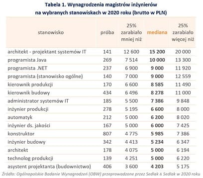 Słowa Tomasza Szpikowskiego potwierdzają dane z Ogólnopolskiego Badania Wynagrodzeń za 2020 rok przeprowadzonego przez Sedlak&Sedlak. Wzięło w nim udział niemal 17 tys. (16 904) osób z wykształceniem wyższym magisterskim inżynierskim. Okazuje się, że połowa magistrów inżynierów zarabiała od 4 839 zł do 10 000 zł brutto, natomiast 10% z nich powyżej 15 000 zł brutto.