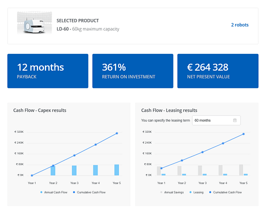 Kalkulator umożliwia przedsiębiorstwom, które rozważają inwestycję w roboty współpracujące lub mobilne, szybki i łatwy wgląd w zwrot z inwestycji na podstawie rzeczywistych danych. Pozwala to użytkownikom oszacować liczbę miesięcy, po których upływie inwestycja się zwróci, uwzględniając inflację oraz stopy procentowe zgodnie z warunkami rynkowymi.