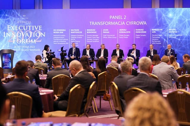 Następnie nadszedł czas na II panel dyskusyjny, moderatorem była Dr Dominika Bosek-Rak, Kierownik studiów podyplomowych Transformacja Cyfrowa, adiunkt w Katedrze Teorii Zarządzania SGH. W gronie panelistów byli: Mateusz Bartoszcze, Zastępca Dyrektora Oddziału Kraków EIB SA, Radca Prawny, Nauczyciel Akademicki, Ireneusz Borowski, Country Manager, Dassault Systèmes, Jacek Figuła, Chief Commercial Officer, Billon Group, Jędrzej Kowalczyk, Prezes Zarządu, FANUC Polska, Dariusz Kwieciński, Prezes Zarządu, Fujitsu, Bogusław Łoś, Dyrektor działu Technology Solutions for Business, APN Promise, Michał Zwyrtek, Dyrektor Finansowy, APA Group. Paneliści dyskutowali m.in. o działaniach, które organizacja musi podjąć, aby zoptymalizować operacje i zwiększyć produktywność, a także o roli cyfryzacji w skalowalności biznesu. Ponadto, wspomniano o największych wyzwaniach w procesie transformacji cyfrowej oraz wpływie obecnej sytuacji ekonomicznej, geopolitycznej, środowiskowej i społecznej na trendy w transformacji cyfrowej. Sporo czasu paneliści poświęcili technologii blockchain i jej zastosowaniu w korporacjach.