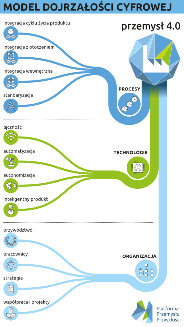 Jednym z najważniejszych wyzwań, z jakim spotykają się specjaliści, jest kojarzenie przemysłu 4.0 wyłącznie z określonymi technologiami, np. robotyzacją lub sztuczną inteligencją. Gdyby tak było, zmiana sposobu działania polskich firm przemysłowych ograniczałaby się wyłącznie do unowocześniania ich parku maszynowego, a dokładniej – do wprowadzenia określonych technologii do procesów produkcyjnych i zarządczych. Jednak w „smart factory”, „smart industry”, czy w wersji europejskiej – przemyśle 4.0, technologia pełni rolę czysto użytkową. Ma zapewnić realizację znacznie głębszej koncepcji dotyczącej wirtualizacji zasobów organizacji i uelastycznienia jej relacji z otoczeniem. Są to idee z obszaru zarządzania, a nie technologii. Dlatego tak istotną rolę w transformacji przedsiębiorstw odgrywa zmiana modeli biznesowych i procesów oraz skupienie się na łańcuchach wartości. Technologia odgrywa drugorzędną rolę – to, czy wdrożymy w firmie druk 3D, wizualizację w oparciu o okulary wirtualnej lub rozszerzonej rzeczywistości, albo zastosujemy w produkcji roboty przemysłowe, nie rozstrzyga o tym, czy staliśmy się firmą przemysłu 4.0. Według Platformy Przemysłu Przyszłości: Warto tutaj przypomnieć model stanowiący część narzędzia do samooceny dojrzałości cyfrowej przedsiębiorstw: