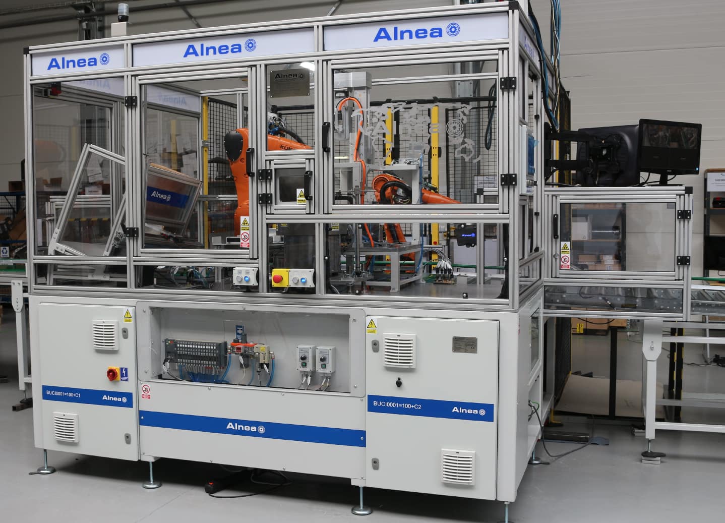 Wszystkie drzwi dostępowe są wyposażone w odpowiednie czujniki otwarcia i zamknięcia. Klatka wygrodzeniowa firmy Troax zapewnia bezpieczeństwo osobom znajdującym się w pobliżu stacji.Bezpieczeństwo to jedna z bardziej istotnych kwestii, które mają olbrzymi wpływ na projekt zrobotyzowanej linii produkcyjnej. Atestowane wygrodzenia, odpowiednie oczujnikowanie i rozwiązania poka-yoke to najlepsza ochrona przez zagrożeniem zdrowia lub życia pracowników czy po prostu ludzkim błędem skutkującym uszkodzeniem stacji i produktów.