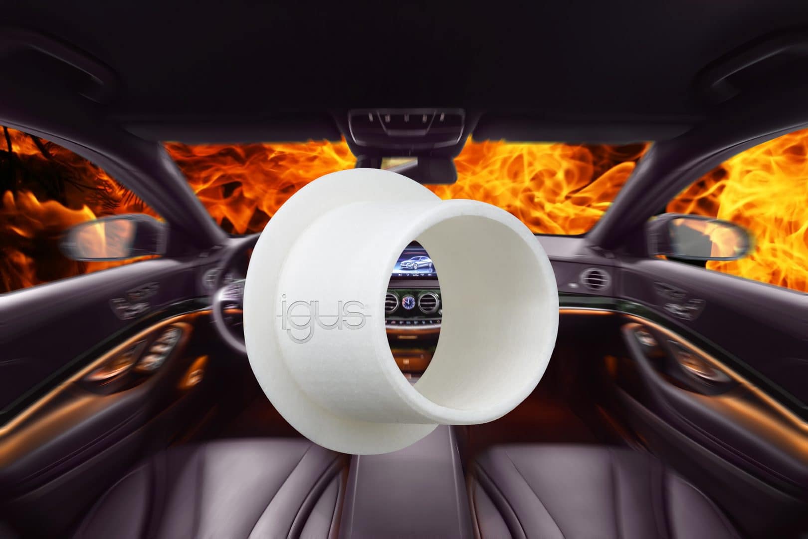 Jak wynika z odpowiednich badań, pożary we wnętrzach pojazdów są głównie wynikiem nieostrożnego obchodzenia się z zapałkami i papierosami. Z tego względu, wykorzystywane w tym środowisku materiały powinna charakteryzować niska zapalność oraz mała prędkość rozprzestrzeniania się ognia. Cechy te mają zapewnić wystarczająco dużo czasu, aby nawet przy dużej prędkości było możliwe zatrzymanie i opuszczenie pojazdu. Trybopolimer iglidur I3, czyli materiał w postaci proszku, stosowany w technologii selektywnego spiekania laserowego, może być stosowany jakoodporny na wycieranie materiał we wnętrzach pojazdów, a ponadto, w ostatnim czasie przeszedł próbę ogniową zgodnie z normą FMVSS 302.