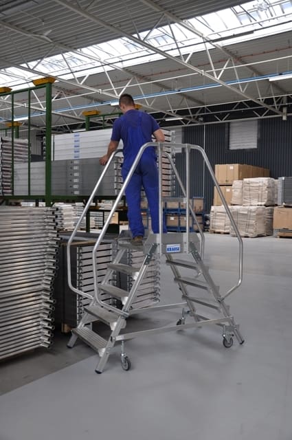 Na rynku dostępnych jest wiele modeli aluminiowych pomostów jezdnych, które ułatwiają pracę w magazynach, warsztatach czy zakładach przemysłowych, czyniąc ją bezpieczniejszą i bardziej efektywną. Zarówno ich użytkownicy, jak i inspektorzy BHP zwracają jednak uwagę, że nie wszystkie oferowane konstrukcje odpowiadają surowym normom bezpieczeństwa. – To prawda – sami również spotkaliśmy się z takimi zarzutami w przeszłości, co zmotywowało nas do poddania weryfikacji naszych pomostów jednych pod kątem bezpieczeństwa właśnie. W skutek tych działań, konstruktorzy KRAUSE opracowali nowe systemy zabezpieczeń, które w pełni odpowiadają polskim wymaganiom BHP – zapewnia Marek Banach. I tak, do dyspozycji oddano dwa modele: z jednostronnym oraz dwustronnym wejściem, oba wykonane wg normy PN EN 131-7. Charakteryzują się one powiększoną do 15 cm listwą przypodłogową oraz wydłużonymi do 1,1 m barierkami ochronnymi ze zintegrowanymi listwami na poziomie kolan. Dzięki niezwykle lekkiej wadze konstrukcji oraz wyposażeniu jej w 4 samoblokujące się rolki skrętne (Ø 125 mm, z czego dwie zaopatrzone w hamulec), z łatwością zmienimy jej pozycję i przesuniemy w dowolne miejsce, nawet wąskie przejście pomiędzy regałami (szerokość od 77 cm w wersji 2×3 stopnie, do 98 cm w przypadku modelu 2×8 stopni). Oba modele oddają do dyspozycji użytkownika wygodny podest z ryflowanego aluminium o wymiarach 600×700 mm, a zespolone połączenie poręczy z barierką platformy, dodatkowo zwiększa bezpieczeństwo.