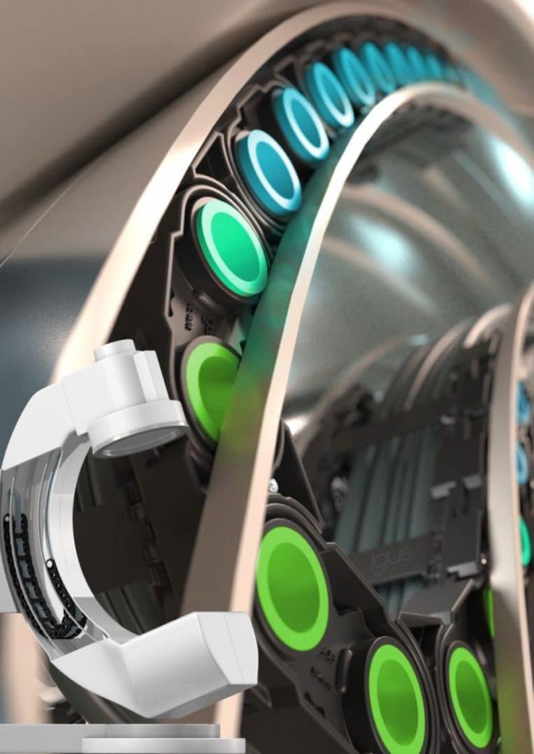 Niezależnie od tego, czy chodzi o aplikacje high-tech, czy low-tech, igus nieustannie bada nowe rozwiązania w zakresie e-prowadników, aby spełnić specjalne wymagania aplikacji przemysłowych pod względem elastyczności, niezawodności oraz niskich kosztów. Z tego powodu specjalista motion plastics opracował lokchain, nową koncepcję składającą się z e-prowadnika z automatycznie wysuwanymi trzpieniami i kompaktową rynną prowadzącą do dynamicznego prowadzenia e-prowadników. Umożliwia to prowadzenie aplikacji wiszących, stojących oraz na boku bez bocznego przyspieszenia. Nawet długie przesuwy z ruchomym biegiem dolnym są możliwe dzięki zamocowaniu lokchain w rynnie biegu górnego. System może być również stosowany w pionowych, okrężnych aplikacjach. Na przykład lokchain jest oczywistym wyborem do zastosowania w kompaktowej przestrzeni obrotowych skanerów rentgenowskich z ramieniem C. Elastyczność tego e-prowadnika daje użytkownikowi możliwość opracowania zupełnie nowych koncepcji projektowania maszyn.