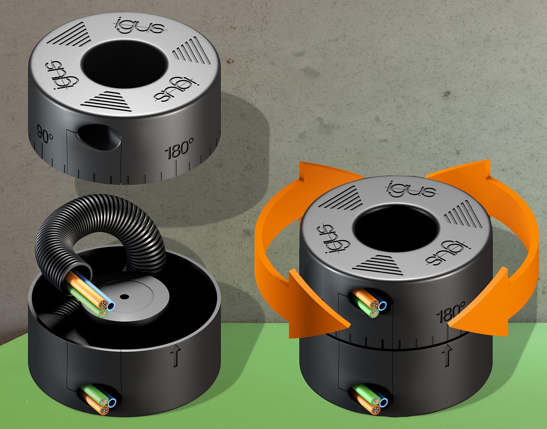 W celu przesyłania energii do obracających się podzespołów, np. w robotach lub obrabiarkach, firma igus od lat opracowuje systemy pozwalające na wykonywanie obrotów o 420 do 600 stopni, a w szczególnych zastosowaniach nawet do 900 stopni. Z myślą o sytuacjach, w których optymalne wykorzystanie ograniczonej przestrzeni jest ważniejsze od możliwości wykonywania kilku obrotów wokół własnej osi, firma igus zaprojektowała kompaktowy moduł obrotowy CRM. „Nowy i bardzo kompaktowy moduł CRM pozwala na wykonywanie ruchów kołowych w zakresie ±180 stopni,” objaśnia Harald Nehring, prokurent ds. systemów e-prowadników w firmie igus. „Ponadto, na obudowie modułu znajduje się skala informująca o kącie obrotu.”