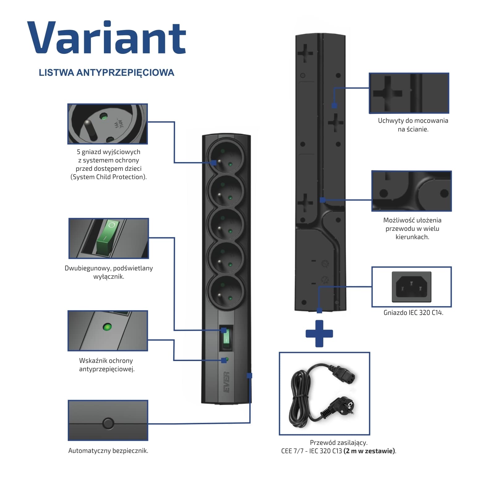 Seria listew antyprzepięciowych CLASSIC (dostępna w trzech długościach przewodów 1,5m, 3m i 5m) zastępuje popularną i bardzo cenioną przez użytkowników serię listew EVER STANDARD. Seria VARIANT natomiast wyróżnia się od pozostałych listew dostępnych na rynku, unikalną możliwością odłączania przewodu zasilającego o długości 2 m (wtyk z uziemieniem CEE 7/7 – IEC C320 C13). Dzięki temu zgodnie z indywidualnymi potrzebami można zastosować przewód innej długości lub zakończony innym rodzajem wtyków. Listwę można również wykorzystać jako przejściówkę z gniazd komputerowych na gniazda polskie.