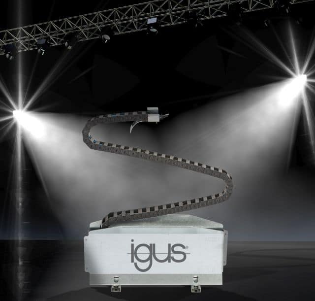 Wszystkie przedstawienia teatralne, operowe oraz musicale wystawiane przez renomowane instytucje z całego świata, takie jak Royal Theatre w Londynie, czy opera w Barcelonie, wymagają spektakularnych scenografii oraz efektownego oświetlenia. Sprzęt sceniczny oraz reflektory są przeważnie przemieszczane w kierunku pionowym. Niezawodne przesyłanie danych i energii do tych urządzeń także wymaga prowadzenia przewodów w pionie. Dodatkowe wyzwanie stanowią wymagania dotyczące wystarczająco cichego ruchu w pionie, a także estetycznego prowadzenia przewodów w ograniczonej przestrzeni. Z myślą o tych sytuacjach firma igus GmbH opracowała ciekawe rozwiązanie – moduł o konstrukcji Zig-Zag: składający się i estetycznie ułożony w zestandaryzowanym pojemniku e-prowadnik, z bezpiecznie prowadzonymi przewodami wewnątrz. Gdy pomost znajduje się w dolnym położeniu, e-prowadnik jest ułożony w pojemniku. Gdy natomiast pomost podnosi się, e-prowadnik rozkłada się i podąża za ruchem – na wysokość do 30 m. Pojemnik z blachy ocynkowanej można dyskretnie połączyć z elementami sceny lub przymocować do ruchomych modułów oświetleniowych. Gdy moduł oświetleniowy jest wyłączany, e-prowadnik rozkłada się w dół. Na życzenie pojemnik może być pomalowany czarną farbą o małym współczynniku odbicia światła lub w innych kolorach.