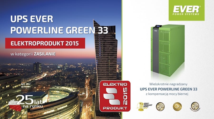 W trzynastej edycji konkursu ELEKTROPRODUKT 2015 rywalizowało 136 produktów w 12 kategoriach. Do redakcji napłynęło łącznie 21 085 głosów na 3 670 kartach konkursowych. W kategorii ZASILANIE Czytelnicy magazynu ELEKTROSYSTEMY najwięcej głosów oddali na serię zasilaczy UPS polskiej firmy EVER Sp. z o.o. pod marką POWERLINE GREEN 33. Seria ta w topologii on-line (VFI), z funkcją kompensacji mocy biernej, zaprojektowana i produkowana w Polsce, była już wielokrotnie doceniona i wyróżniana przez Ekspertów różnych gremiów.