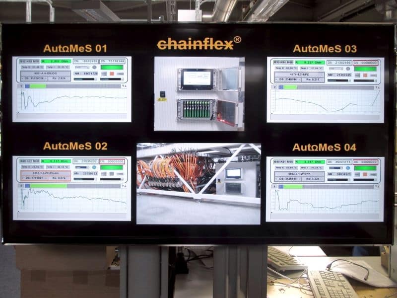 Sam fakt, że podczas badań lub rzeczywistego użytkowania przewód uległ uszkodzeniu, nie świadczy o konieczności udoskonalenia jego konstrukcji. Niezwykle ważna jest natomiast możliwość wykrycia, że dany przewód zaczyna pękać. Innymi słowy: kiedy przewód zaczyna wykazywać oznaki zużycia, zanim jeszcze faktycznie wystąpi awaria powodująca szkody? Tylko w ten sposób podczas badania takiego przewodu można znaleźć metodę zapobiegania przyczynom awarii. W celu rejestrowania ogromnej liczby danych pomiarowych z laboratorium, firma igus, wykonująca ponad 1,4 miliona pomiarów rocznie, opracowała system „AutΩMeS”. Jest to w pełni automatyczny system pomiarowy, który ze względu na modułowość, może być dostosowywany do różnorodnych urządzeń badawczych. Pozwala on na ciągłe monitorowanie właściwości elektrycznych przewodów, a tym samym na szybkie i niezawodne wykrywanie w