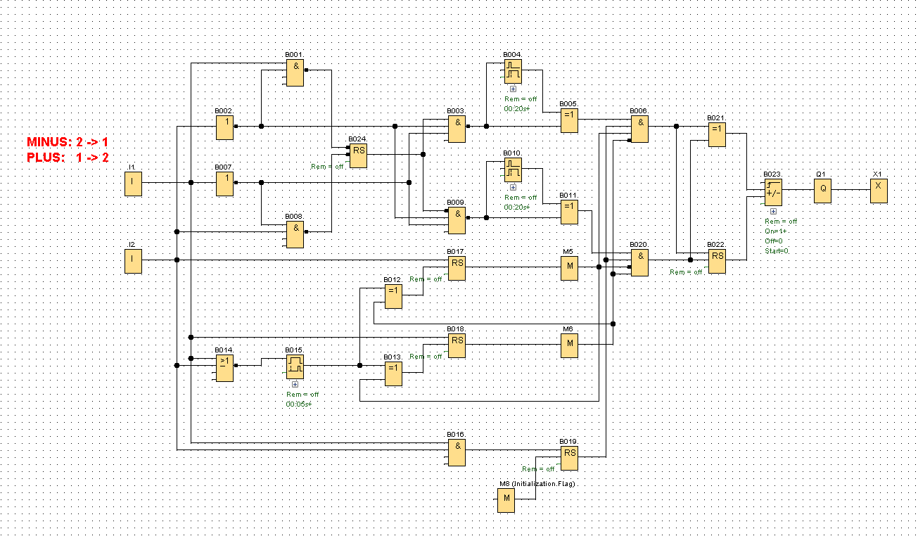 Jak wspomniano, napięcie ze styków czujników powinno być doprowadzone do wejść I1 (z czujnika „1”) oraz I2 (z czujnika „2”). Program jest tak napisany, że kierunek ruchu od I1 do I2 powoduje wygenerowanie impulsu na wyjściu bramki B020, natomiast od I2 do I1 na wyjściu bramki B006.