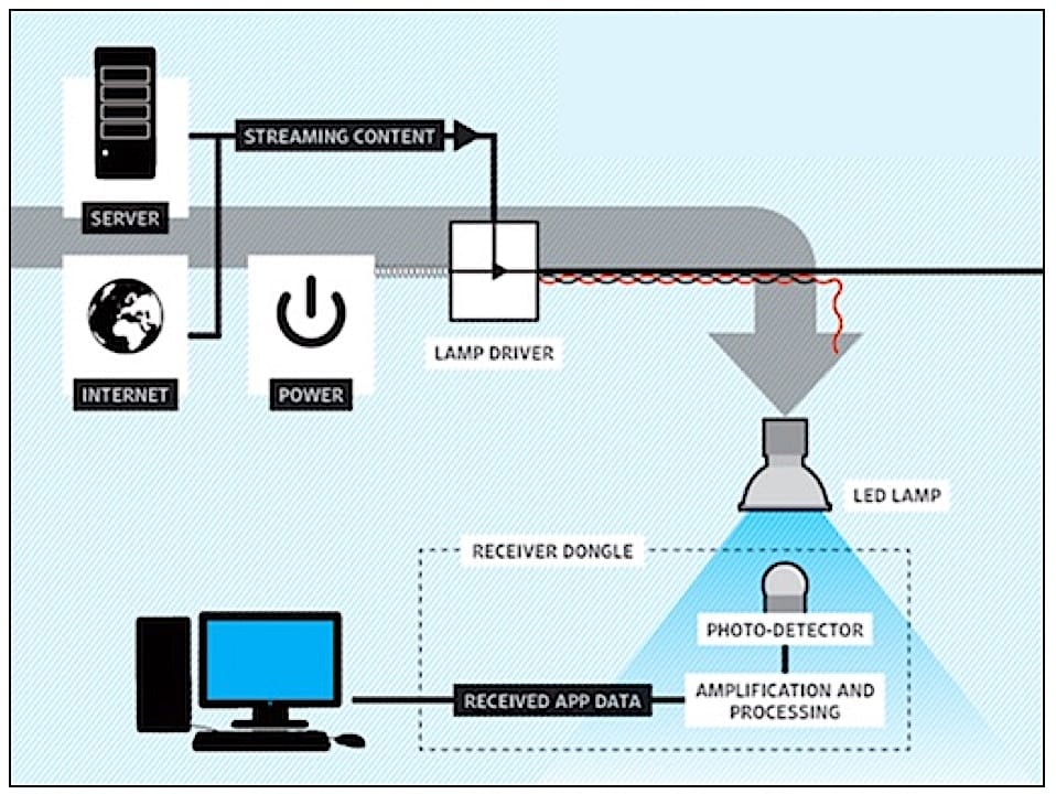 Do wykorzystania technologii Li-Fi niezbędny jest punkt dostępowy, który pełni rolę nadajnika sygnału. Za pomocą kabla ethernetowego sygnał przekazywany jest do żarówki LED, wyposażonej w kontroler odpowiedzialny za bezprzewodową komunikację. Sygnał wysyłany przez żarówkę będzie odbierany i dekodowany przez fotodetektor w urządzeniu – komputerze, laptopie czy smartfonie.