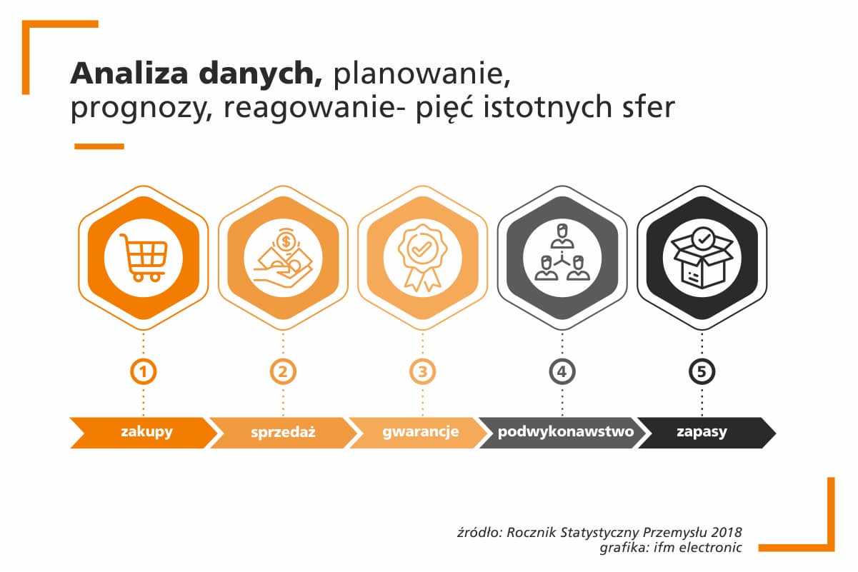 Analiza danych i ich optymalizacja może prowadzić do zidentyfikowania obszarów produkcji, mających wpływ na obniżenie kosztów, polepszenie efektywności i usprawnienie decyzyjności. Korzyści z zastosowania optymalizacji danych we współczesnych procesach produkcyjnych przyczyniają się też bezpośrednio do analizowania cenników, zarządzania wydatkami czy listą płac. Przy planowaniu, prognozowaniu i reagowaniu, specjaliści wyróżniają pięć istotnych sfer, w których możliwe jest analizowanie danych. To: zakupy, sprzedaż, gwarancje, podwykonawstwo i zapasy.