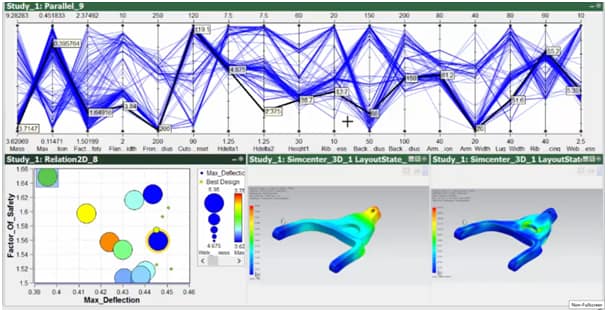 Rys. 9. Rozkład graficzny odkształceń oraz naprężeń wraz z wykresem parametrów i ich wpływ na optymalizację w środowisku HEEDS