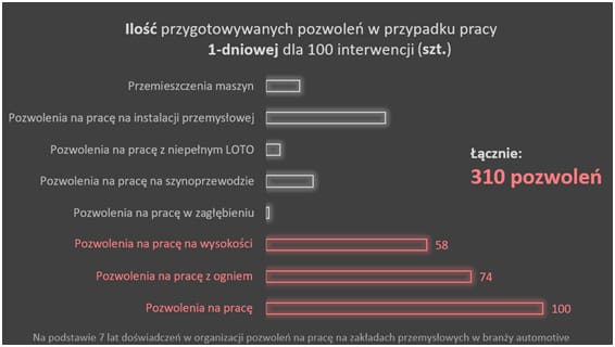 Powyższy wykres prezentuje jakiego typu prace i prace szczególnie niebezpieczne wymagają organizacji stosownego pozwolenia w celu przeprowadzenia działań w dowolnej lokalizacji na terenie hali produkcyjnej. Widać na nim również ile łącznie potrzeba pozwoleń w przypadku stu losowych prac związanych z awariami, zleconymi pracami czy też planowymi naprawami. Pozwolenie na pracę jest obowiązkowe. Pozostałe pozwolenia przygotowuje się stosownie do sytuacji.